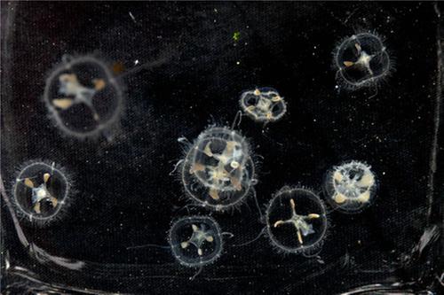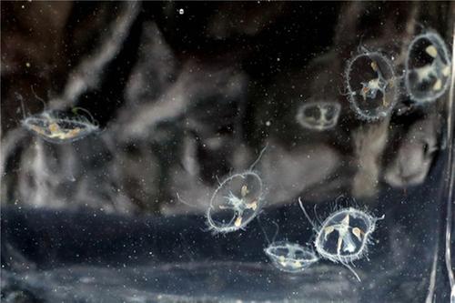 走進(jìn)綠樹成蔭、環(huán)境清幽的山莊內(nèi),在一條水渠聯(lián)通的池塘內(nèi),只見(jiàn)成群結(jié)隊(duì)的成百上千只水母在水中游動(dòng)。這些水中精靈全身呈透明狀,身體中間像有四個(gè)花瓣形狀,周圍有很多細(xì)小觸角,運(yùn)動(dòng)時(shí)有節(jié)奏地張弛、上下涌動(dòng)搖擺。由于它形狀如桃花,多生長(zhǎng)在春天桃花盛開季至秋季,因此而得名。