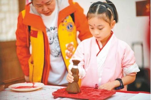 青少年學(xué)習制作夾江年畫。