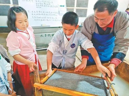 青少年學(xué)習、體驗抄撈紙張。