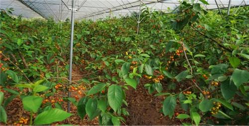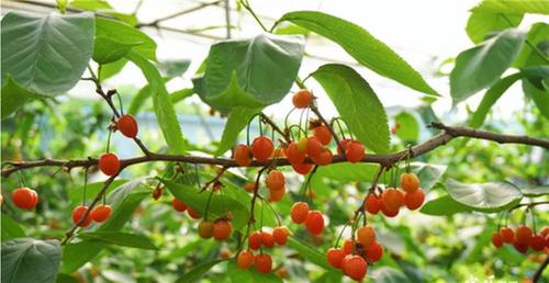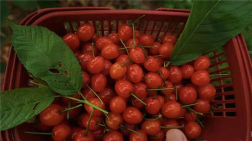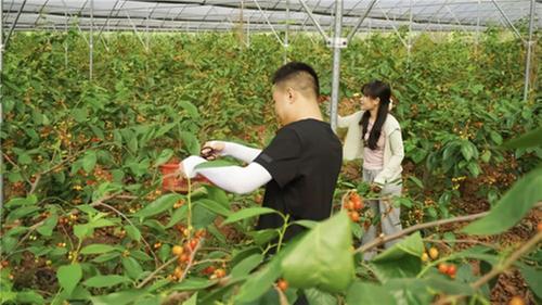 走進(jìn)聯(lián)合社的櫻桃大棚,一簇簇瑪瑙紅櫻桃如紅寶石般晶瑩透亮,綠葉掩映下更顯誘人。