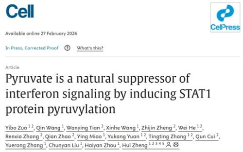 2月27日,四川省醫(yī)學科學院·四川省人民醫(yī)院、電子科技大學醫(yī)學院鄭慧教授團隊在國際頂尖學術(shù)期刊《細胞》上發(fā)表題為“Pyruvate is a natural suppressor of interferon signaling by inducing STAT1 protein pyruvylation”的研究論文。