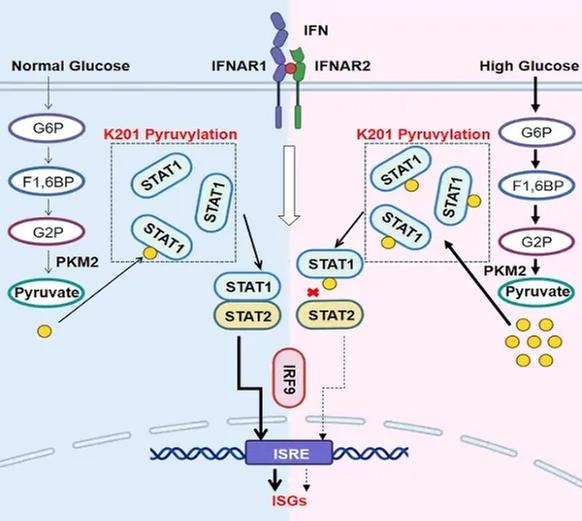 同時,該研究在國際上首次報道了一種新的蛋白質(zhì)翻譯后修飾——蛋白丙酮酸化修飾(Protein Pyruvylation),發(fā)現(xiàn)丙酮酸可作為小分子供體,與IFN-I信號通路中的關(guān)鍵信號蛋白STAT1發(fā)生共價結(jié)合,形成STAT1蛋白丙酮酸化修飾。STAT1蛋白的丙酮酸化修飾抑制了STAT1與STAT2的結(jié)合,進而抑制了IFN-I信號通路的傳導,最終減弱了IFN-I信號的強度。高糖條件下,體內(nèi)STAT1蛋白丙酮酸化修飾顯著增加,從而減弱了機體IFN-I介導的抗病毒免疫力。
