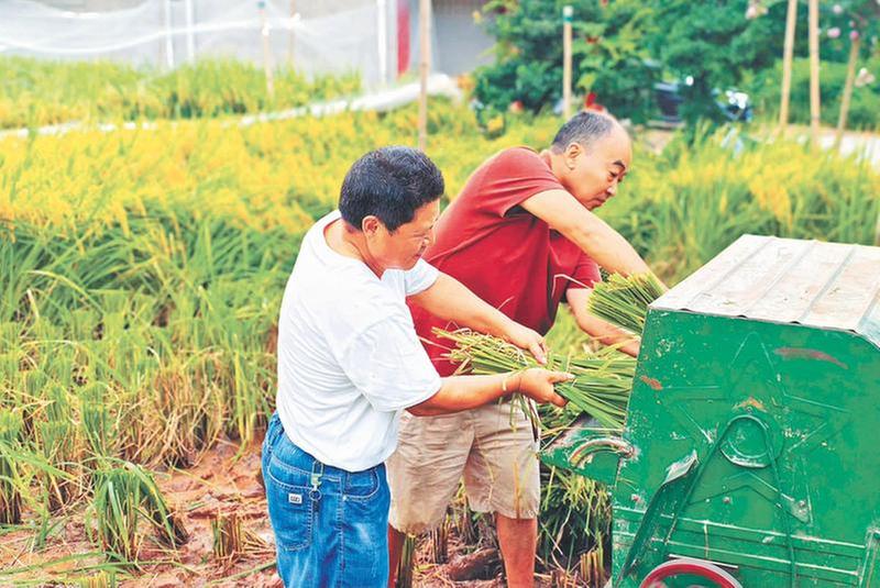 8月13日,眉山市丹棱縣“大雅銀齡·老年志愿”農(nóng)技服務(wù)隊隊員劉敬宗(左)、文榮中(右),在張場鎮(zhèn)金峽村,幫助農(nóng)民收獲新品種水稻,拉開了該縣水稻收割的帷幕。(鄭顯陽 攝影報道)