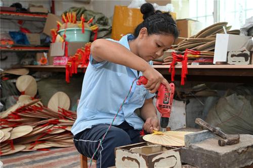 近年來,金銀嘴村采取“黨支部+合作社+基地+農戶”的模式,因地制宜發(fā)展蒲葵種植和蒲扇加工業(yè),目前年加工生產蒲扇500余萬把,產品遠銷廣東、福建等地,成為當地有名的“蒲扇村”。 夏至時節(jié),金銀嘴村家揚蒲葵種植專業(yè)合作社一派繁忙景象,村民正忙著加工制作蒲扇,保障市場訂單供應。
