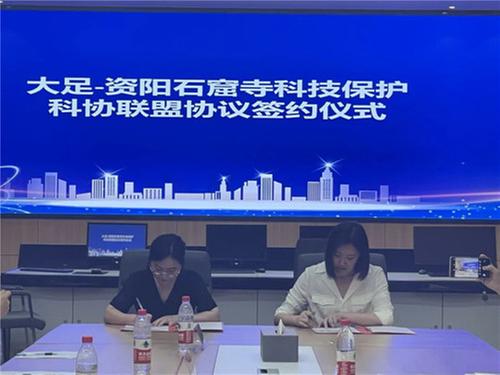 為凝心聚力服務(wù)成渝地區(qū)雙城經(jīng)濟圈建設(shè),8月30日,重慶市大足區(qū)、四川省資陽市兩地科協(xié)在大足石刻文物醫(yī)院舉行石窟寺科技保護科協(xié)聯(lián)盟協(xié)議簽約儀式。資陽市科協(xié)主席肖素敏,大足區(qū)科協(xié)主席朱朝瓊、副主席夏玉秀,大足石刻研究院保護工程中心主任陳卉麗等20人參加簽約儀式。大足區(qū)科協(xié)黨組書記趙柏楊主持儀式。