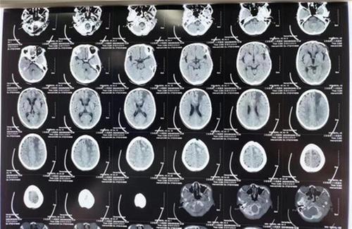 5月30日下午,被家人發(fā)現(xiàn)倒地、昏迷,伴嘔吐、大小便失禁的陳婆婆由急診科外院接回,雙側(cè)瞳孔等大等圓,對(duì)光反射遲鈍,右側(cè)肢體無(wú)反應(yīng),左側(cè)肢體疼痛刺激曲屈活動(dòng)。經(jīng)CT掃描顯示“左側(cè)額葉腦出血,血腫大小約6.2*3.5cm”,于19點(diǎn)18分緊急入住神經(jīng)外科。