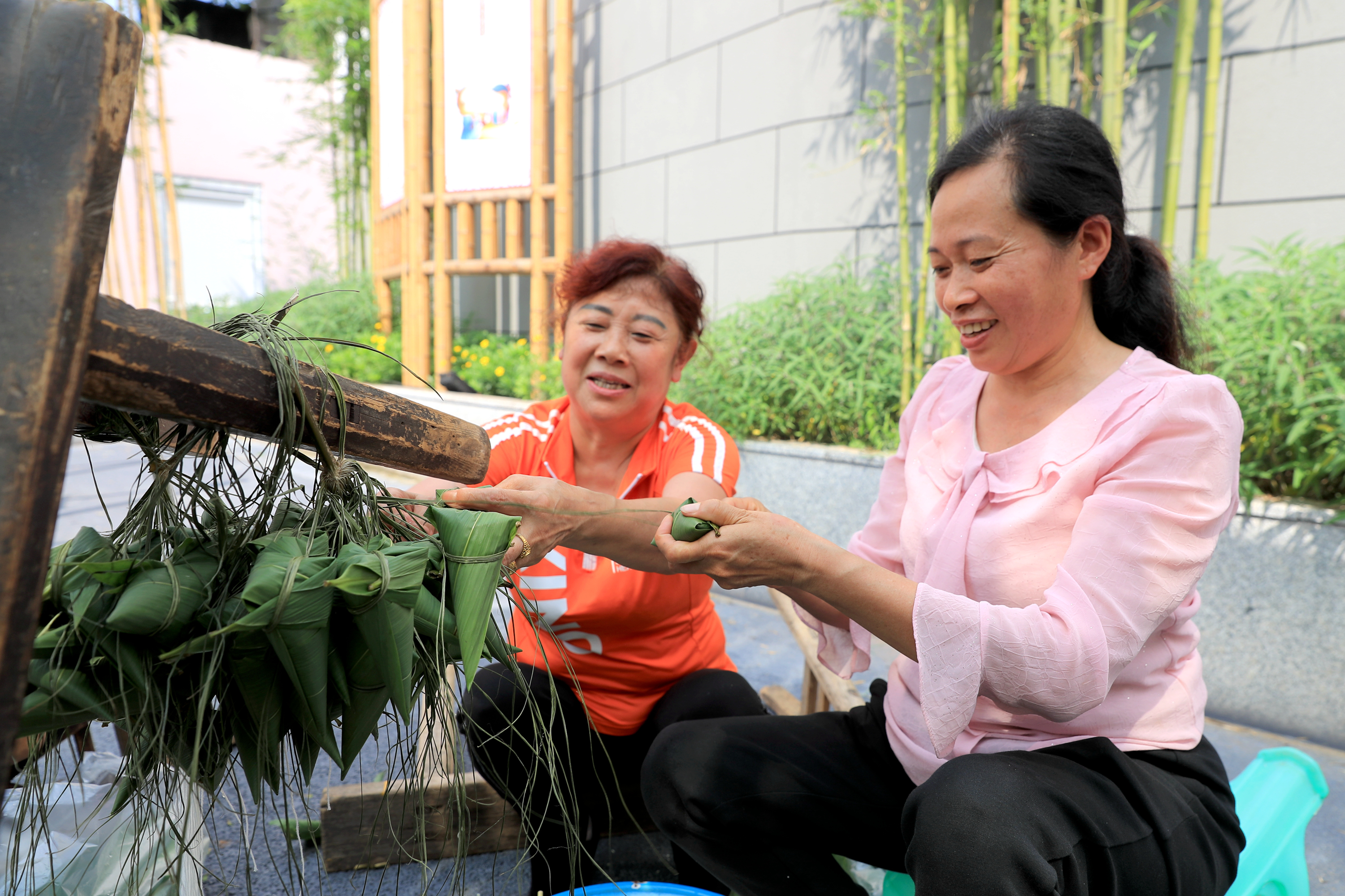 端午包粽子是必不可少的環(huán)節(jié),在小區(qū)院壩里,三三兩兩的群眾聚在一起,互相學(xué)習(xí)包粽子、拉家常。“選擇大小差不多的粽葉并排放好,左手捏住粽葉上端,右手將粽葉卷成圓錐形狀,然后裝泡好的糯米……”周阿姨一邊示范一邊指導(dǎo)年輕人如何包粽子。