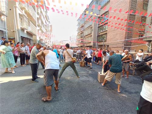 伴隨一片歡聲笑語,迎來了最后的打糍粑環(huán)節(jié),把主題活動推向新高潮。隨著一聲“打糍粑,開始!”現(xiàn)場4支隊伍用力揮舞著手中的木棒,相互配合的隊友,你一下,我一下……很快就打好了糍粑,服務(wù)人員把剛打好的熱糍粑分成小塊,搓成一個個小圓球,再用壓餅器壓成月餅形狀或者直接用毛糍粑,粘上提前準備好的豆粉、白糖,把美味香甜的手工糍粑分發(fā)給現(xiàn)場200余名居民分享。大家一邊討論做法、一邊聊著家常,看著自己巧手加工出來的糍粑,在一派其樂融融的贊許聲中,享受著滿滿的成就感。