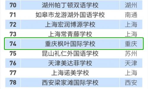 在2021年福布斯中國(guó)·國(guó)際化學(xué)校年度百?gòu)?qiáng)榜單中,重慶楓葉榜上有名,排名第88名。2022年,重慶楓葉更上一層樓,排名上升至74名,西南地區(qū)排名前3,也是重慶市(共21所國(guó)際學(xué)校,含國(guó)際部)唯一上榜的國(guó)際學(xué)校。
