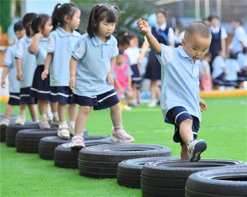5月22日,南充市蓬安縣城東幼兒園的小朋友在進(jìn)行“踩輪胎”體能訓(xùn)練。彭圣洲 攝。