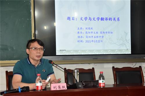 中國(guó)翻譯協(xié)會(huì)專(zhuān)家會(huì)員、中國(guó)作家協(xié)會(huì)會(huì)員、四川省作家協(xié)會(huì)主席團(tuán)委員、簡(jiǎn)陽(yáng)市作家協(xié)會(huì)名譽(yù)副主席劉榮躍,用簡(jiǎn)單的事例,結(jié)合豐富的理論知識(shí),從“文學(xué)離不開(kāi)翻譯,翻譯中包括文學(xué)”“文學(xué)與文學(xué)翻譯的異同”“從實(shí)例中看文學(xué)翻譯如何再創(chuàng)作”等七個(gè)方面,闡述了文學(xué)與文學(xué)翻譯的關(guān)系,讓在場(chǎng)師生對(duì)國(guó)內(nèi)外經(jīng)典文學(xué)譯作的誕生有了更加深刻的認(rèn)識(shí),為在場(chǎng)師生閱讀經(jīng)典文學(xué)打開(kāi)了思路、拓寬了眼界,為文學(xué)愛(ài)好者創(chuàng)作文學(xué)精品力作提供了坐標(biāo)、指引了方向。
