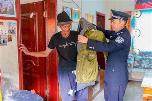接下來(lái)是進(jìn)村入戶(hù),語(yǔ)言不通,與群眾說(shuō)不上話,交不上心,仿佛彼此都是聾啞人,但又不懂手勢(shì)語(yǔ)言,大家都懵在那兒無(wú)所適從。但每天到村委會(huì)看到飄揚(yáng)的紅旗,心中的惆悵頓消,“一名黨員一面旗幟”,有種力量驅(qū)使黨員楊江山認(rèn)真工作。一條小河從河谷中心流過(guò),灌溉著河谷兩旁的農(nóng)作物和青草地,養(yǎng)育著成群的牛羊和牲畜。當(dāng)在村干部帶領(lǐng)下第一次看望貧困戶(hù)支布子合時(shí),楊江山更加堅(jiān)定了留下來(lái)扶貧幫困的決心。這個(gè)50多歲的跛腳男人,一個(gè)政府幫扶修建的漂亮小院里,住房整潔而不失煙火氣,盛放著收獲的5000余斤土豆、2000余斤玉米,還飼養(yǎng)著一群牛羊。在政府的幫扶下,他用自己的雙手脫貧。因?yàn)楹庸壤锾鞖夂?,這次,楊江山給他們夫婦送來(lái)了厚厚的防寒服,還當(dāng)場(chǎng)為他們換衣服看大小是否合適。穿著舒適而溫暖的衣服,兩口子拉著楊江山笑得格外開(kāi)心。