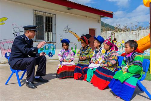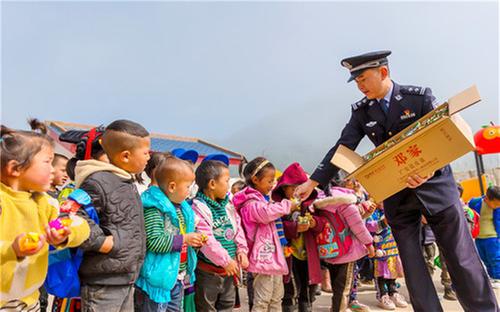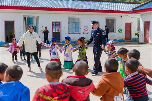 “國(guó)慶回廣安探親,我買(mǎi)了些家鄉(xiāng)特產(chǎn),今天要去村上幼兒園看望一下孩子們。”身著警服的他搬出幾大箱廣安特產(chǎn)“老鄧”鹽皮蛋和幾大袋五色糖果,在大家的幫助搬運(yùn)下,來(lái)到覺(jué)撒鄉(xiāng)馬依村保幼兒園。“我給孩子們帶了一些家鄉(xiāng)特產(chǎn),請(qǐng)他們分享一下我家鄉(xiāng)的美味兒。”楊江山對(duì)馬依村保幼兒園彝族女老師吉克伍牛說(shuō)。一會(huì)兒,吉克老師指揮孩子們列隊(duì)歡迎。吉克老師依次給孩子們分發(fā)鹽皮蛋和糖果,孩子們興奮不已。楊江山站在隊(duì)列前,大聲地對(duì)孩子們說(shuō):“小朋友們,這次國(guó)慶節(jié)我回到家鄉(xiāng)廣安,給大家?guī)?lái)家鄉(xiāng)特產(chǎn),請(qǐng)大家品嘗。你們都是新時(shí)代祖國(guó)的花朵,我們要養(yǎng)成愛(ài)清潔講衛(wèi)生的好習(xí)慣,吃糖果后,要把糖紙扔進(jìn)垃圾桶。最后,我要看看你們最近跟老師學(xué)的舞蹈,行嗎?”“謝謝楊警官,我們?yōu)槟欢蚊褡逦璧浮?rdquo;孩子們異口同聲。在歡快的音樂(lè)聲中,民警楊江山與孩子們跳起彝族民族舞蹈“達(dá)體舞”。吉克伍牛老師說(shuō):“楊警官每個(gè)月都要到幼兒園來(lái),檢查園內(nèi)安全,給孩子們講故事,講毒品知識(shí),講養(yǎng)成清潔衛(wèi)生好習(xí)慣,孩子們挺喜歡他的。小朋友們回家后,還要求家里人移風(fēng)易俗、講清潔愛(ài)衛(wèi)生。有他在,我們有一種莫名的安全感。”