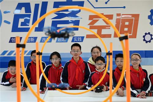 4月2日,內(nèi)江市東興區(qū)外國語小學(xué)“創(chuàng)客空間”實(shí)驗(yàn)室,創(chuàng)客社團(tuán)的學(xué)生正在操控?zé)o人機(jī)進(jìn)行穿越障礙物飛行。
