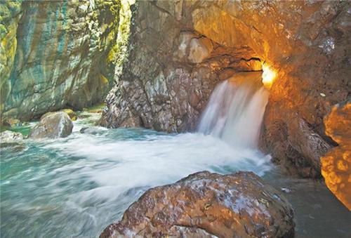 然而,真論起景區(qū)最為險峻的景觀,當屬趙家河流域幽邃的峽谷中的“一線天”。此處陡崖如削,頭頂一線青天,有“一夫當關(guān),萬夫莫開”之勢。曾禎介紹,它是先前山民通行魚泉河與趙家河唯一的山間小道,是發(fā)育的裂隙在流水侵蝕和晝夜溫差大的情況下不斷加深加寬,最終因重力及震動作用,形成峭壁對峙的景觀。