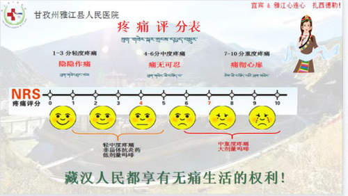 掛了電話后鐘慧想,護(hù)士長知道了,醫(yī)生知道了嗎?病人知道了嗎?于是她馬上聯(lián)系雷開鍵主任、李莉護(hù)士長、陳曦、劉麗霞一起制作藏漢雙語的疼痛評分表,制作過程中藏語的翻譯難住了大家,賈鈺銘教授專門打電話給西藏成辦醫(yī)院腫瘤科梅朝蓉主任,她那里會藏漢語的專家多,鐘慧多次與雅江溝通、聯(lián)系、幫扶,在他們的幫助下解決了難題。