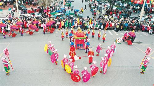 跟隨人群,探班員向著聲音源頭緩步前進。幾分鐘后,人群在年畫村黨群服務(wù)中心前的廣場停下了腳步,廣場上,幾十人組成的腰鼓隊身著綠色戲服,手持黃綢鼓棒,整裝待發(fā),原來這里正在進行腰鼓表演和送財神活動。據(jù)悉,從大年初一至元宵節(jié),年畫村每天都會安排各式各樣的新春民俗活動,游客可以現(xiàn)場體驗游園會、投壺、推雞公車等活動。