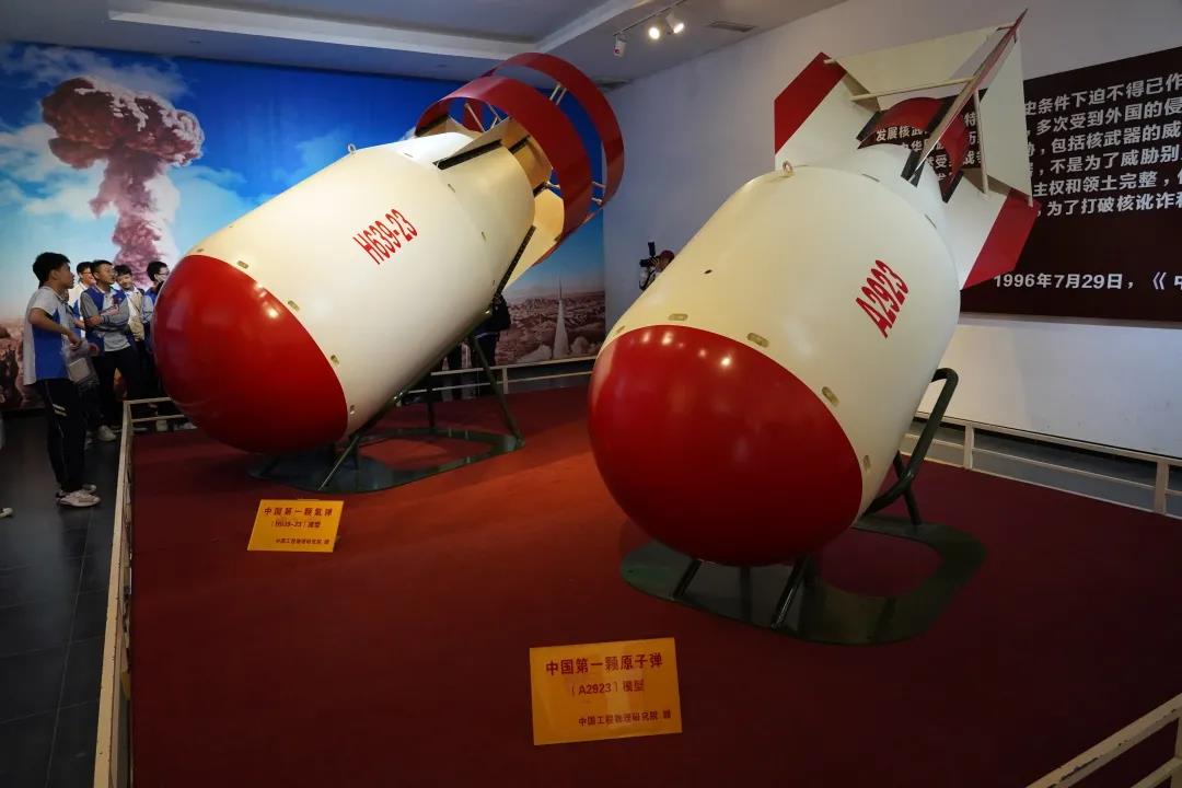大院里,曾經(jīng)神秘的紅磚樓房,已改建成了兩彈歷程館,向人們展現(xiàn)中國(guó)核彈武器化事業(yè)的發(fā)展歷程。最先映入眼簾的是高聳在展廳右側(cè)的兩朵“蘑菇云”,這是中國(guó)第一顆原子彈和第一顆氫彈爆炸時(shí)的場(chǎng)景模型,在“兩朵云”的正前方,擺放著一顆型號(hào)為A2923、型號(hào)為H639-23的原子彈、氫彈模型。這兩個(gè)看似普通的“彈頭”所蘊(yùn)含的卻是無數(shù)科研人員的艱苦探索和所有中國(guó)人的驕傲。