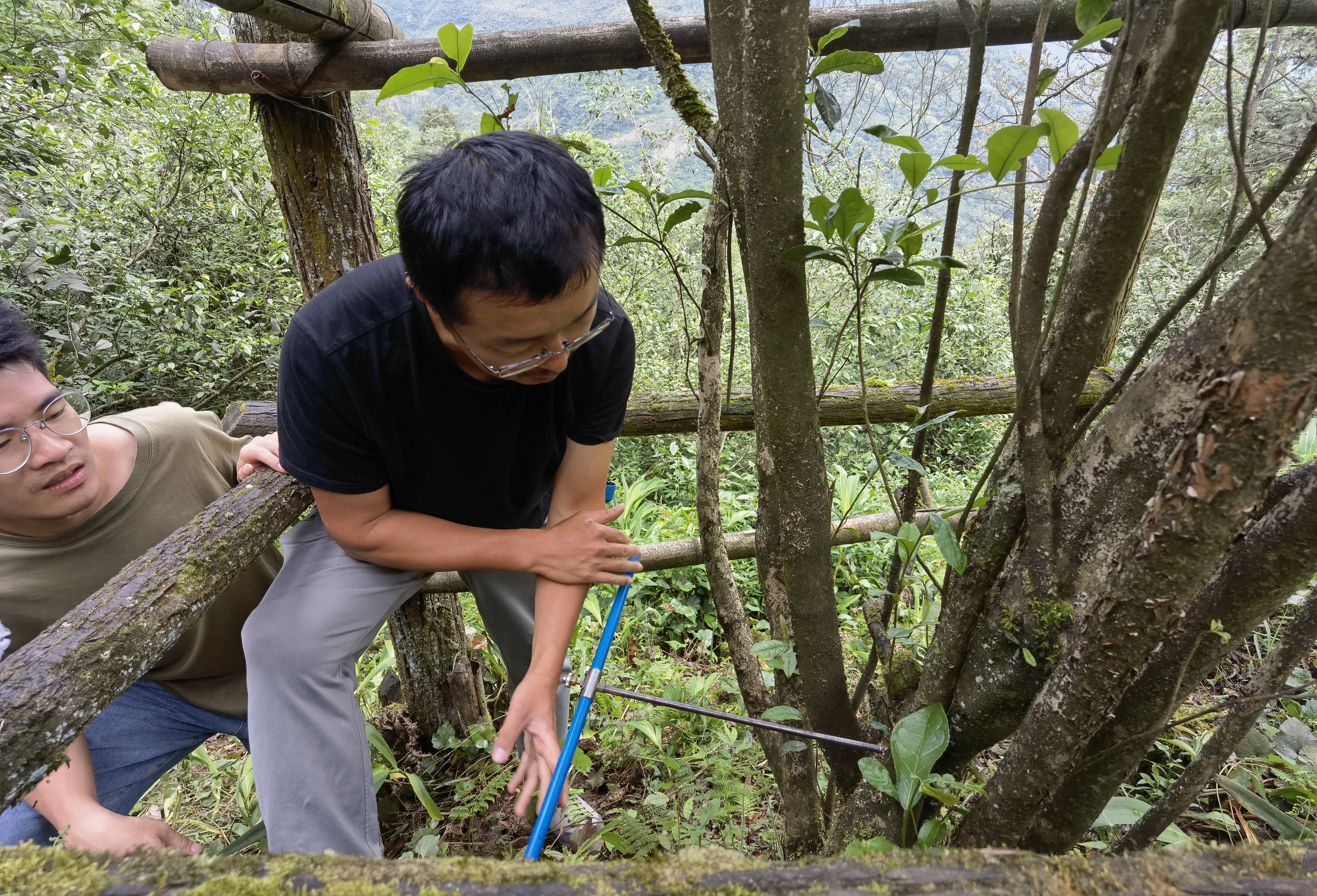 當(dāng)年 6月2日,繆寧團(tuán)隊(duì)前往該公司高山茶基地對古茶樹樹齡進(jìn)行現(xiàn)場測量。進(jìn)入茶園,只見郁郁蔥蔥的茶樹分布山頭,其中一棵被圍起來的茶樹格外顯眼。“這是茶園目測最大的一棵茶樹,當(dāng)?shù)氐牟铇湟话愠晒嗄緺睿@棵都已長成喬木了。為了保護(hù)好這棵古茶樹,我們特地在茶樹周圍建了圍欄,打了地樁,為茶樹做支撐。”楊宏彥向?qū)<覉F(tuán)隊(duì)介紹道。鑒于這棵茶樹的樹齡,還要確保取樣后茶樹不受創(chuàng)傷,僅測量方法專家團(tuán)隊(duì)就商議了半天時間,最終選取了鉆芯取樣法。經(jīng)過查看、分析、探討,專家團(tuán)隊(duì)對古茶樹進(jìn)行了成功取樣。
