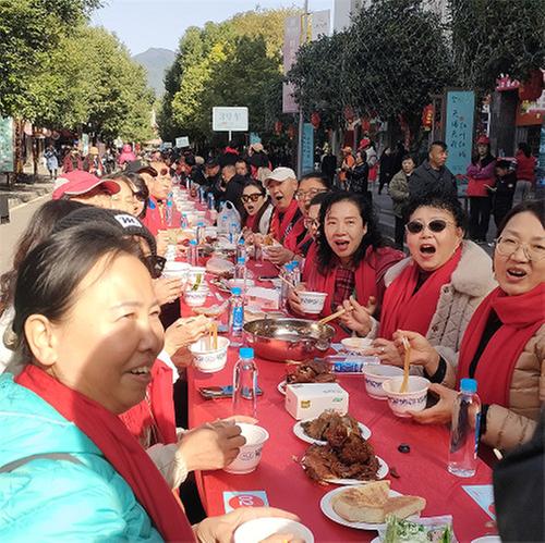 酸辣粉、紅軍餅、木門鹵雞、五權馮鴨子、木門醪糟湯圓、核桃花卷、綠茶酥……11月25日中午,伴著暖陽煦風,“博旅國際聯(lián)盟”國際知名旅行商代表們分坐在旺蒼縣城振興路上200余米長的餐桌旁,上演了一幕熱火朝天的大型嗦粉場景。