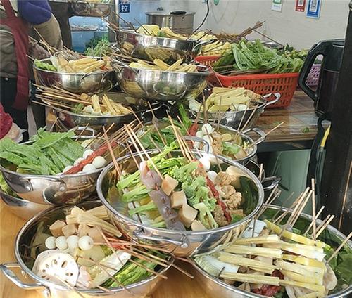 “歡迎客人們來旺蒼,來品嘗我們的特色小吃!”有著20多年開店經(jīng)驗的“敏敏串串香”老板詹敏說,當日的酸辣粉是由振興路相鄰的3家串串香店承擔煮制。為了完成這一任務,她們從早上8點開始準備,每家每盆準備了9個素菜、3個葷菜、2碗苕粉,共計出餐100余盆。