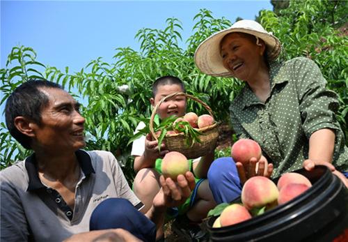 5月25日,內(nèi)江市東興區(qū)雙橋鎮(zhèn)元覺村欣悅軒桃園,當(dāng)?shù)剞r(nóng)民趁著晴好天氣采摘脆桃。
