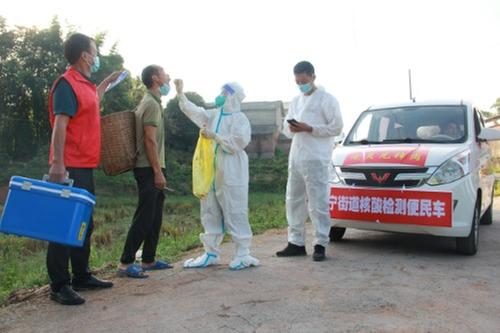 核酸檢測便民車一會(huì)兒穿梭在田間地頭、一會(huì)兒又駛進(jìn)農(nóng)家院壩,好似一道奮勇抗疫的美麗流動(dòng)風(fēng)景線。