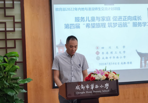 成都市華西小學(xué)林克友深情致辭,對(duì)參與此次活動(dòng)的師生表達(dá)深深的敬意:“這個(gè)盛夏,在香港回歸祖國(guó)25周年之際,香港和成都連線,一群充滿愛心,有理想信念,有責(zé)任擔(dān)當(dāng),胸懷大志的志愿者架起一座交流橋梁。華西小學(xué)此次牽手香港理工大學(xué),四川大學(xué)參與此次活動(dòng),讓孩子們走進(jìn)希望旅程,筑夢(mèng)遠(yuǎn)航,促進(jìn)他們正向成長(zhǎng)。此次活動(dòng),一定能夠?yàn)槿A西少年積蓄成長(zhǎng)力量,促進(jìn)健康和發(fā)展,會(huì)成為大家珍貴的回憶!”