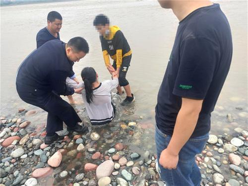 接警后,洪川派出所值班所領導迅速帶領民輔警趕赴現(xiàn)場開展疏導救援工作。到達現(xiàn)場后,發(fā)現(xiàn)一名不遠處的河水中有一位身著白色體恤的女孩,正緩緩向江水中央蹚去。旁邊有幾位10多歲的同齡人在不停勸說,但女孩不為所動繼續(xù)向河中心蹚去。 “你看你這么年輕,怎么想不開?想想家里人咋辦?”派出所輔警王毅反復勸說,姑娘卻不為所動。見此情況,王毅和民警急切下脫掉鞋子,赤著雙腳下河喊道:“你別動別動,我下去拉你。”