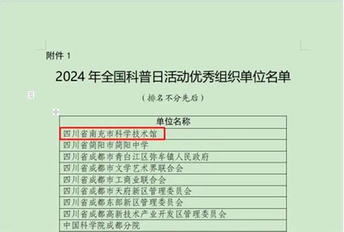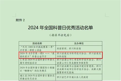 近日,中國科協(xié)辦公廳發(fā)布了《中國科協(xié)辦公廳關(guān)于對2024年全國科普日有關(guān)組織單位和活動予以表揚的通知》,其中南充市科學(xué)技術(shù)館榮獲“2024年全國科普日活動優(yōu)秀組織單位”的殊榮,同時該館舉辦的2024 年《開學(xué)第一課——美麗的家鄉(xiāng)》科普公益節(jié)目更是被評為“2024年全國科普日優(yōu)秀活動”。至此,南充市科學(xué)技術(shù)館已連續(xù)三年獲得此榮譽稱號。
