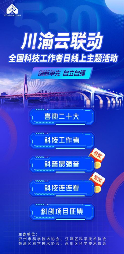為大力弘揚科學家精神,激發(fā)科技工作者的榮譽感、自豪感、責任感,團結凝聚廣大科技工作者以強大的創(chuàng)新自信奮進高水平科技自立自強新征程,以飽滿的精神狀態(tài)和昂揚的奮斗姿態(tài),迎接黨的二十大勝利召開,2022年5月27日至5月31日,瀘州市科學技術協(xié)會聯(lián)合重慶市永川區(qū)科學技術協(xié)會、江津區(qū)科學技術協(xié)會、榮昌區(qū)科學技術協(xié)會,開展了“創(chuàng)新爭先 自立自強”為主題的第六個“全國科技工作者日”線上活動。