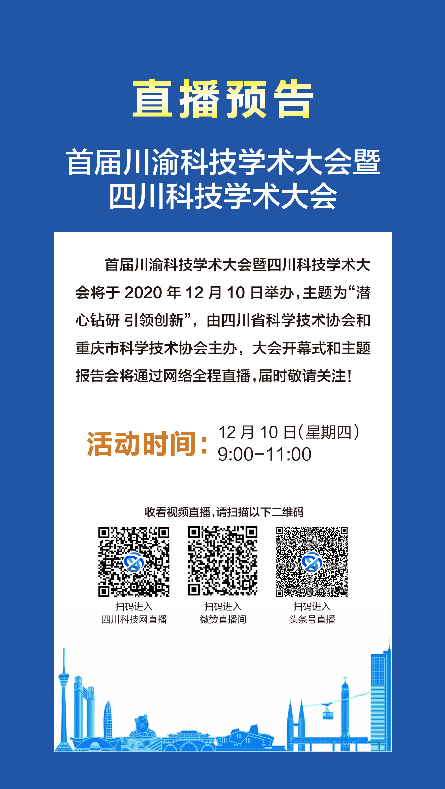 如果不能親臨現(xiàn)場(chǎng)也不用擔(dān)心,大會(huì)將在線上、線下雙線并行,通過(guò)網(wǎng)絡(luò)平臺(tái)直播開幕式及學(xué)術(shù)報(bào)告會(huì),為川渝兩地市民朋友們送上一場(chǎng)精彩紛呈的“學(xué)術(shù)盛宴”。