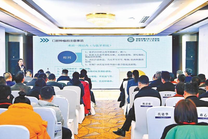“種植牙包括三個(gè)部分,分別是種植體、基臺(tái)及其上部修復(fù)結(jié)構(gòu)。我們依托這種種植修復(fù)方式,可以恢復(fù)患者缺失牙或牙列的形態(tài)和功能的新型義齒。”走進(jìn)資陽(yáng)路演活動(dòng)現(xiàn)場(chǎng),資陽(yáng)市雁江區(qū)人民醫(yī)院(資陽(yáng)市第三人民醫(yī)院)口腔科副主任醫(yī)師付冬梅正在向與會(huì)嘉賓介紹口腔種植技術(shù),演示屏上是一張種植牙的模型圖。付冬梅介紹,該技術(shù)可以應(yīng)用于單顆牙缺失、多顆牙缺失以及全口牙缺失,它改變了傳統(tǒng)牙列缺損修復(fù)方式,具有防止缺牙后牙槽骨繼續(xù)萎縮、避免損傷真牙、美觀舒適的效果。