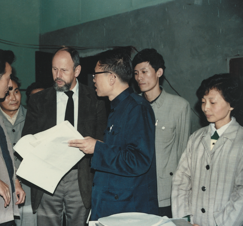 1982年著名齒輪專家德國慕尼黑大學溫特教授(右四)前來訪問,黃潼年(右三)介紹錐齒輪整體誤差測量技術