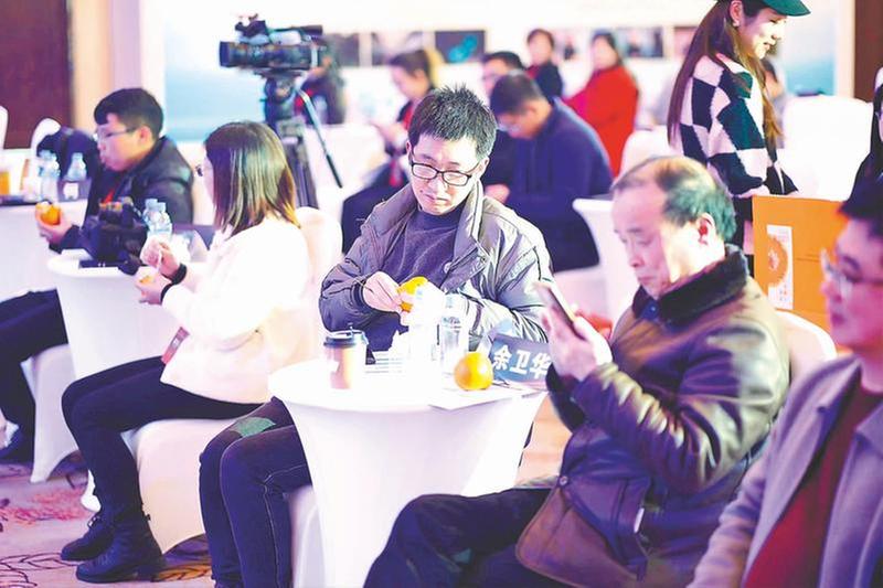 臺(tái)上,何杰在分享著經(jīng)驗(yàn);臺(tái)下,嘉賓們?cè)谄穱L著柑橘。